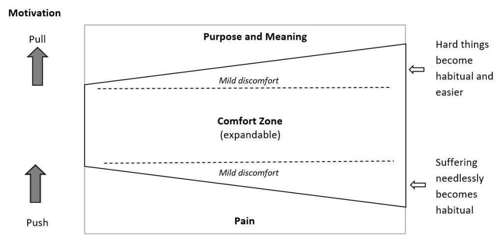 Recall, the first thing to ask is what is important enough to make it our priority – this is where purpose sits in the diagram above. It resides outside our comfort zone, which is also where our potential sits.